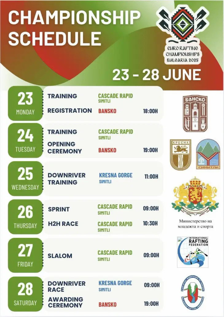 The event is co-created by the Bulgarian Rafting Federation and Bansko Town Hall, with backing from the Ministry of Youth & Sports, and the municipalities of Kresna and Simitli.